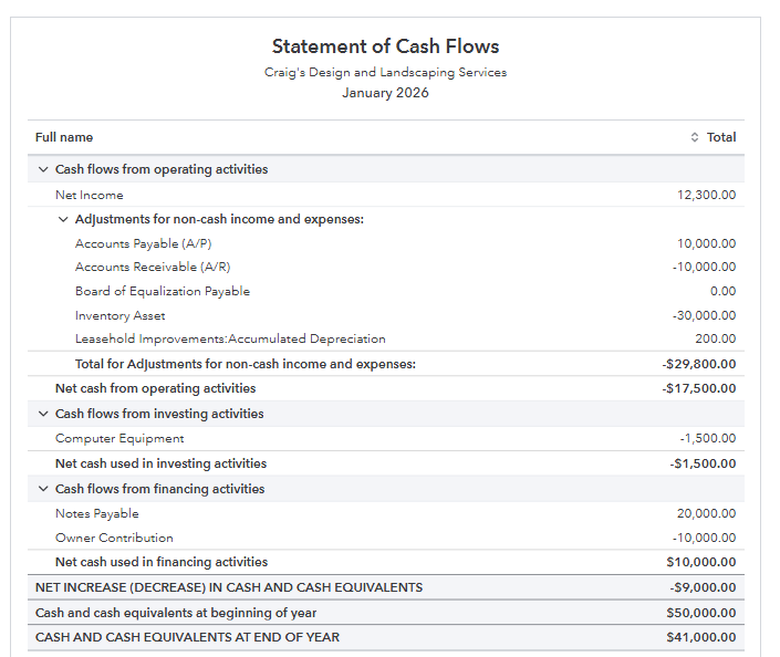 When we go back to the cash flow statement, we see that same $12,300 listed as net income, which is exactly what we expect. Everything else on this report is coming from the balance sheet.